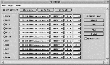 Post processing involves applying calibration curves to the chosen normalized peak data from a flight experiment (i.e., Area, Height, etc.). Post processing is separated from the flight processing to allow easy alterations to final data set in case of a calibration scale changes or appearance of data outliers. Post processing stores no data in its experiments, and extracts normalized descriptor fields from the flight experiments as it needs them for processing. Post processing in HATSchrom is organized in such order that changes to either calibration curves or flight experiments can be made while PostProc is active and open. Post processing simply catalogs the flight experiments and calibration curves and allows the user to assign the calibration dates, polynomial fit orders, de-trending (normalization) fit orders to each molecule in each flight experiment, so that this information does not need to be re-entered to produce exchange files at a later date.